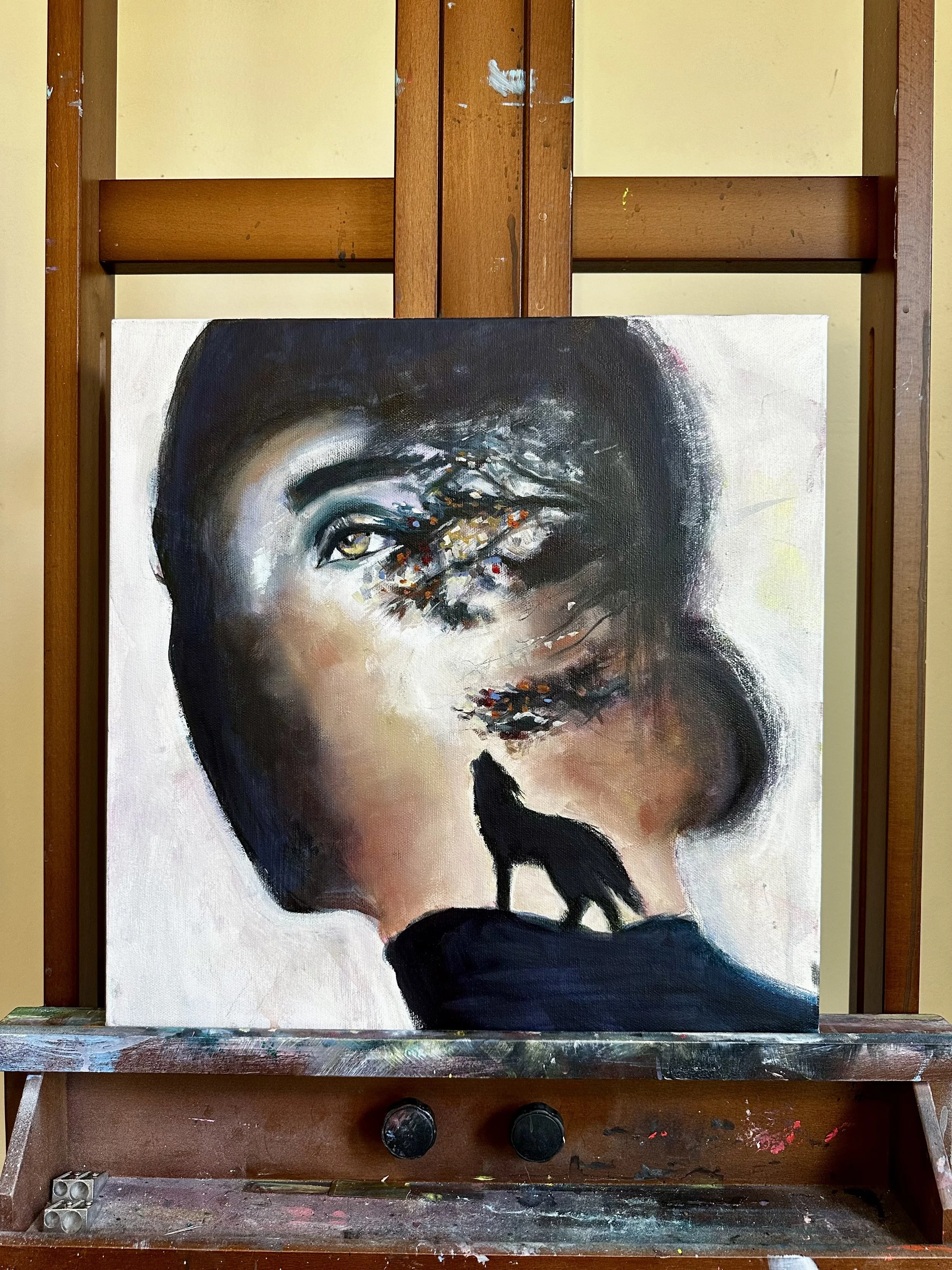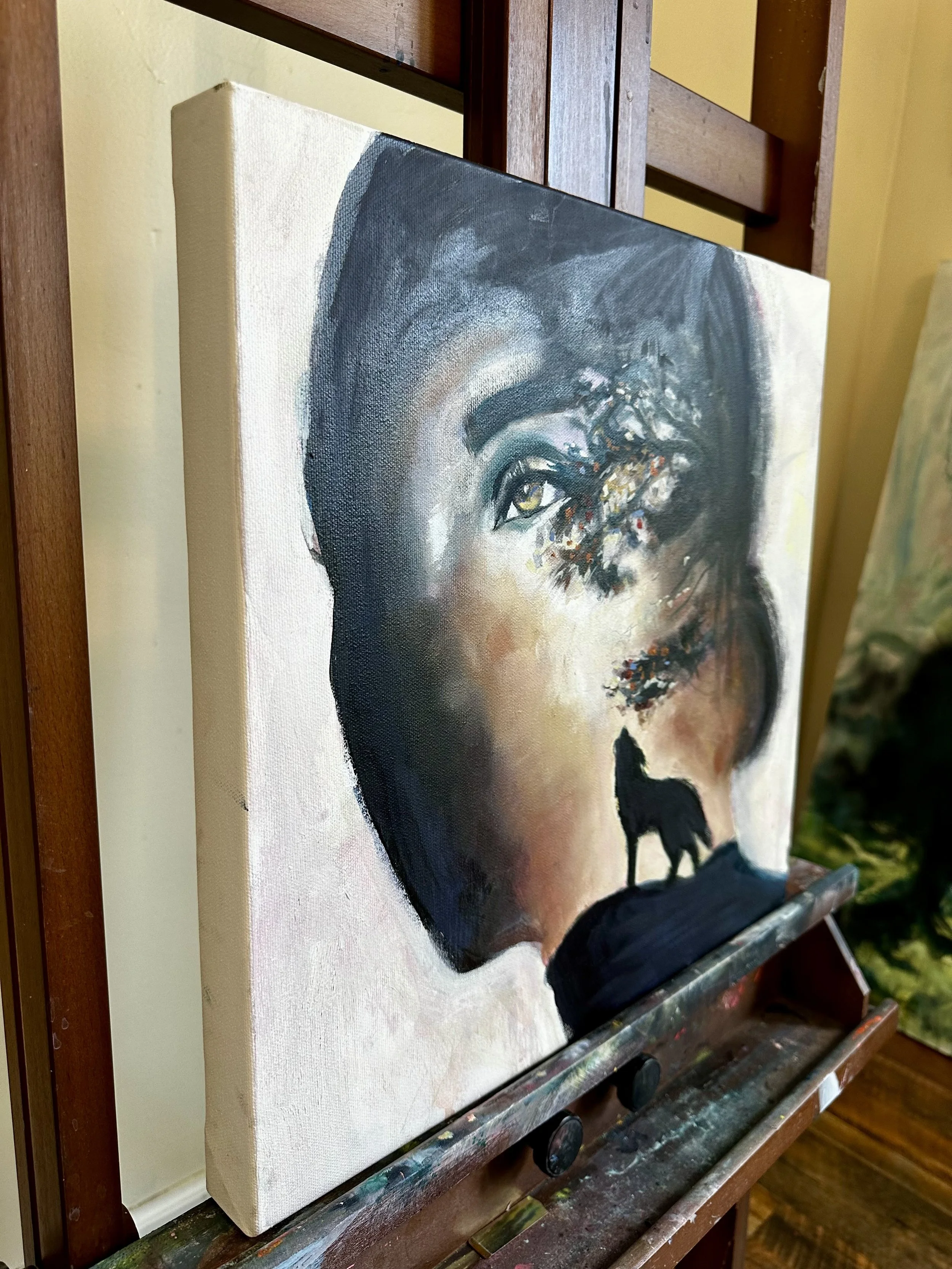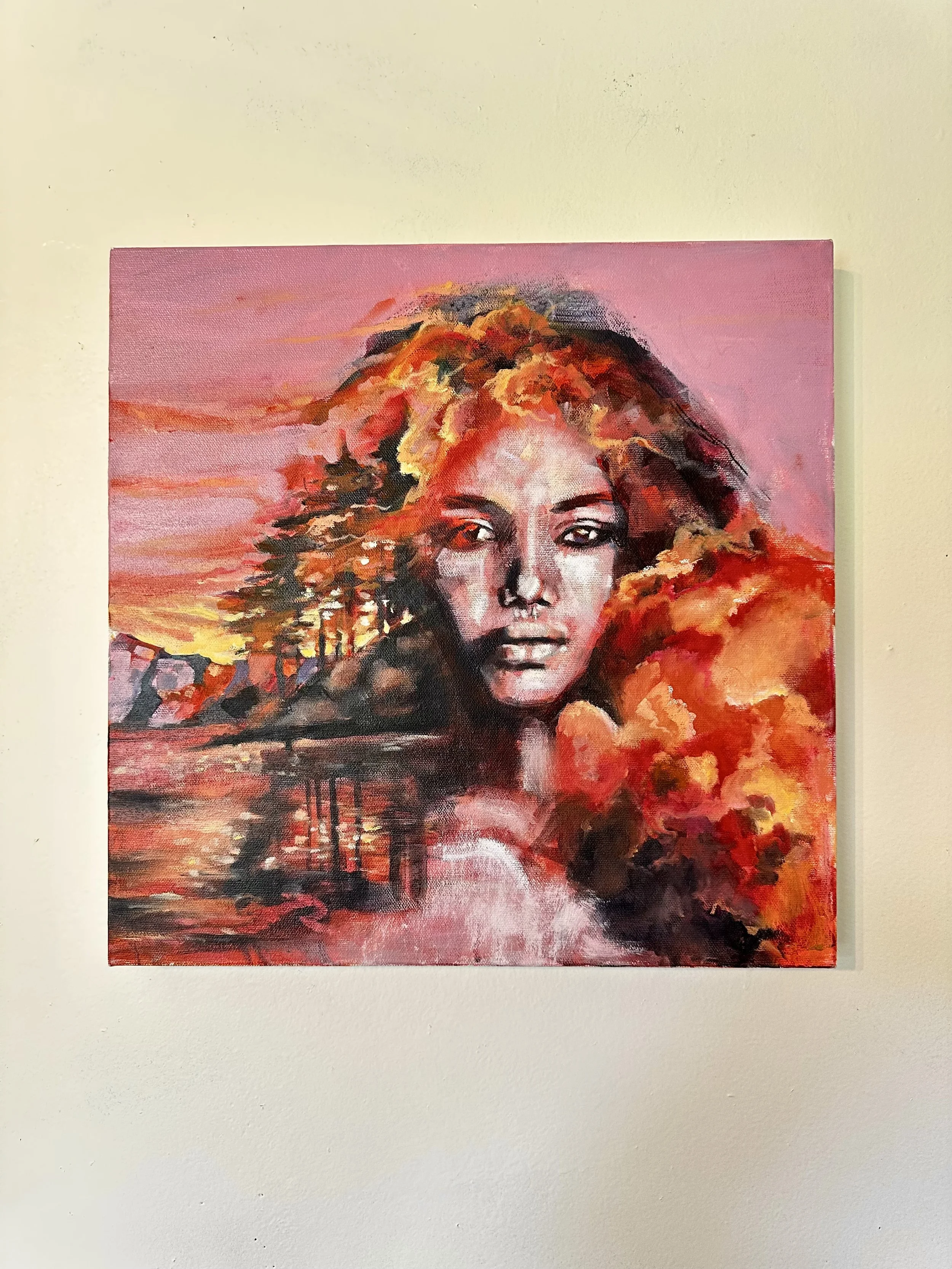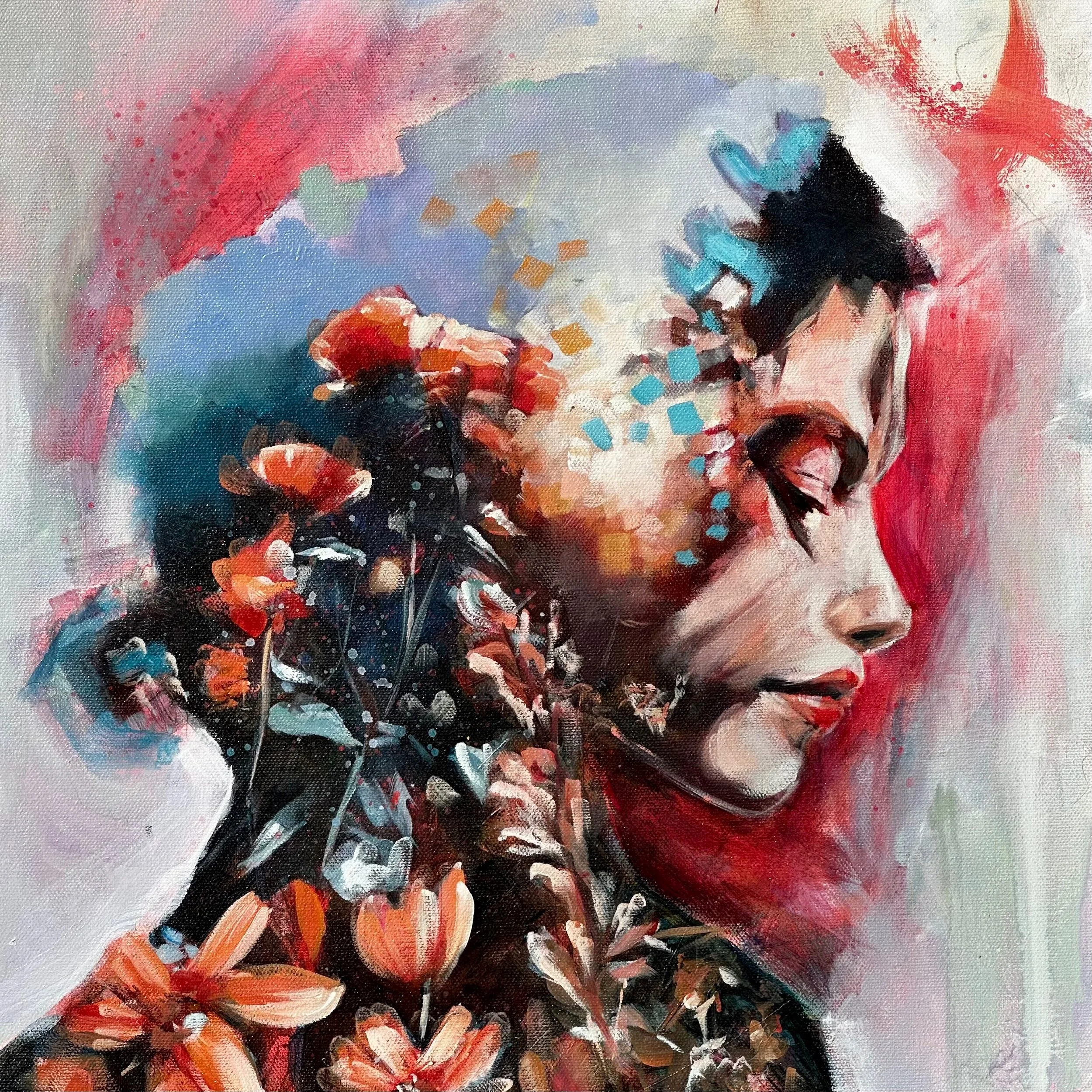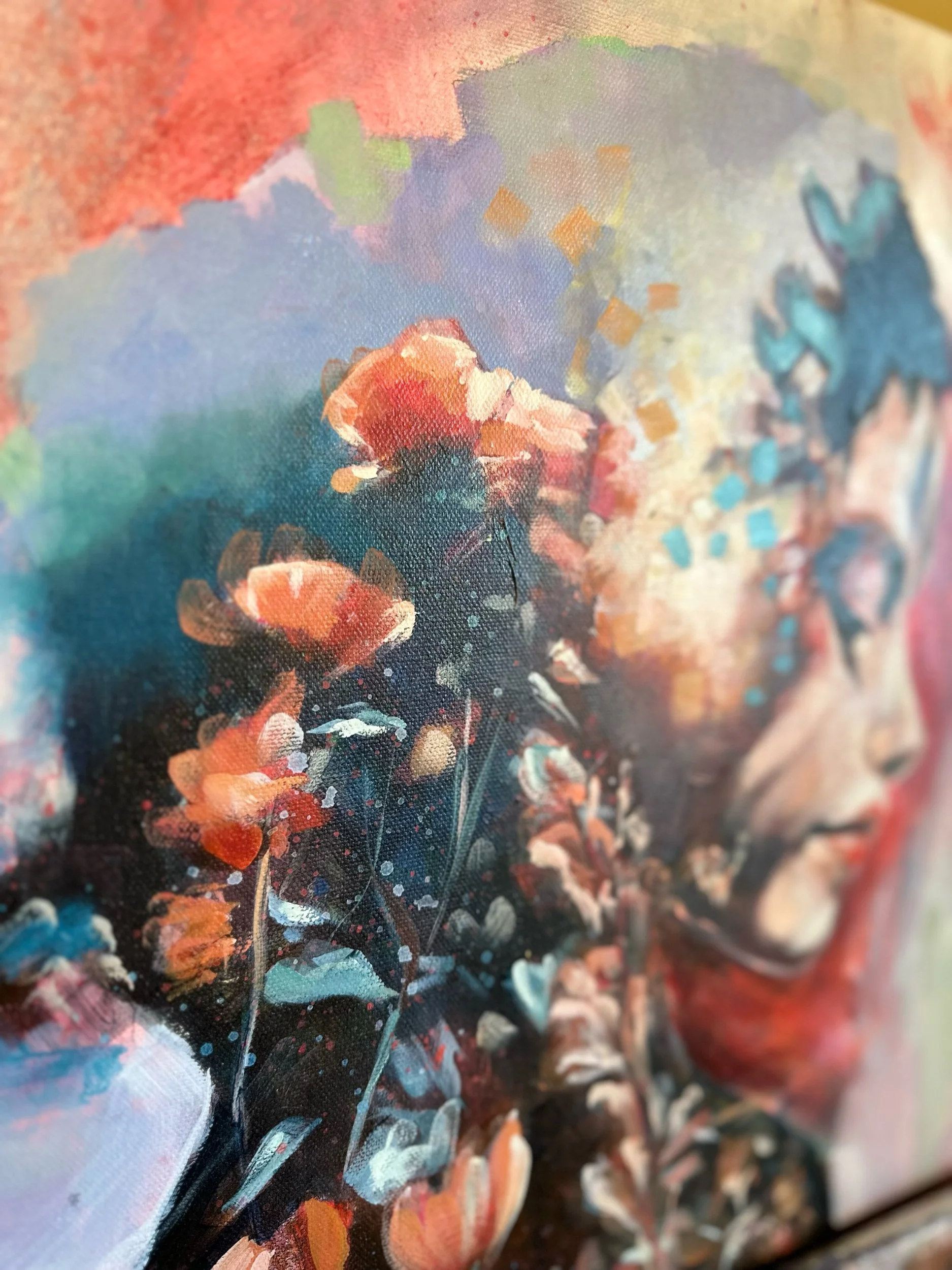 Arcrylic, pastel, spray paint, and oil paint on gallery wrapped canvas.